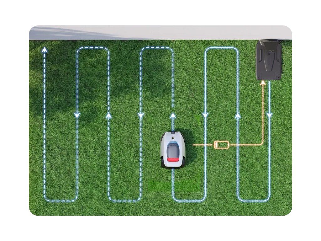 Při poklesu energie pod 15 % se sekačka vrátí do stanice a po dobití pokračuje tam, kde přestala.